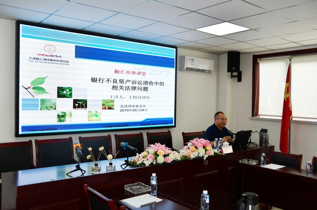 为进一步提升青年律师的成长与发展,促进律师队伍建设。2019年5月24日下午,我所联合天津融汇律师事务所共同举办培训讲座《不良资产的清收》,本次讲座我们特地邀请了天津融汇律师事务所主任、天津市政协委员、天津市政府法制智库专家王殿禄主任主讲,我所及天津融汇律师事务所律师共计50余人参加了此次培训。