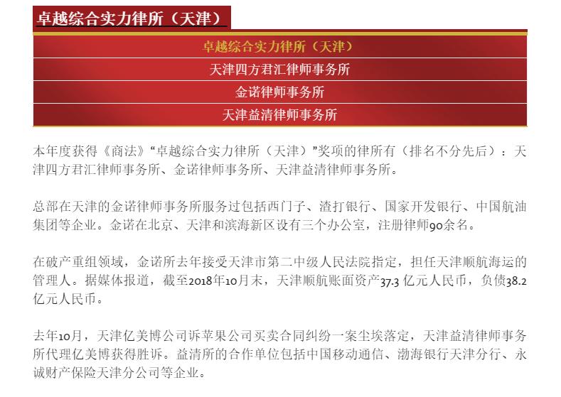 喜讯三:天津益清律师事务所荣获《商法》2020卓越综合实力律所大奖