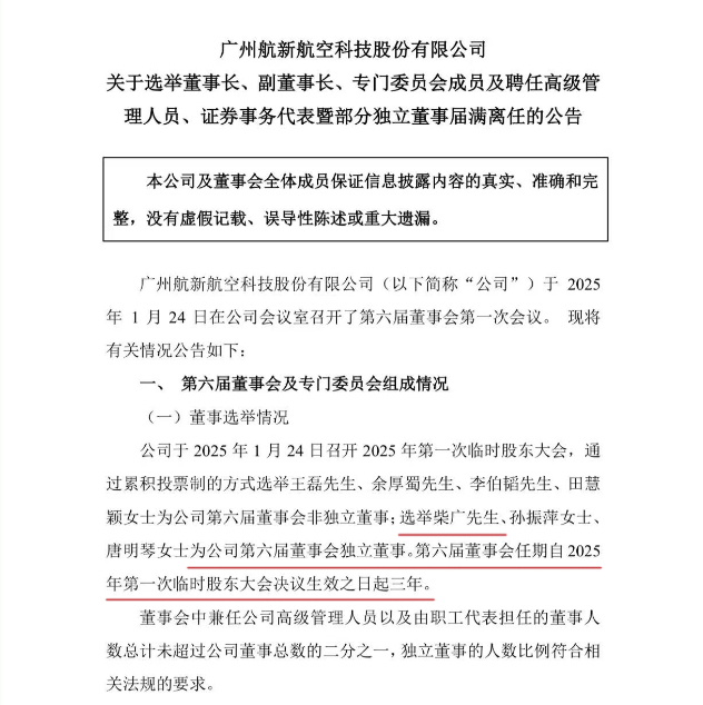 2025年1月24日,广州航新航空科技股份有限公司在公司会议室召开了第六届董事会第一次会议,我所副主任柴广凭借其深厚的法律功底和在资本市场领域的丰富经验,成功当选公司独立董事,任期三年。