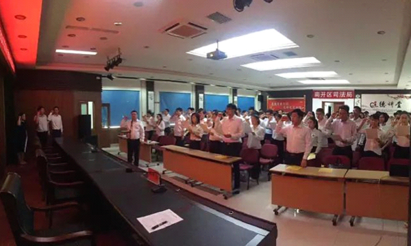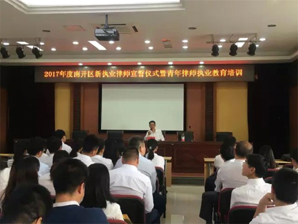 2017年9月4日、6日,在南开区司法局五楼大会议室举办了第一、二期“南开区新执业律师宣誓仪式暨青年律师执业教育培训”。南开区司法局副局长任丽荣、南开区律工委副主任杨涛、市律协副会长温志胜、韩士队、南开区司法局政治处主任梁迎春,以及两期共236名,自2016年1月1日至2017年8月15日申请并取得律师执业证的本区律师参加培训。两期培训由我所主任韩士队分别搭档市律协副会长温志胜、南开区律工委副主任杨涛共同担任主讲人,由南开区司法局法服科王媛媛主持。