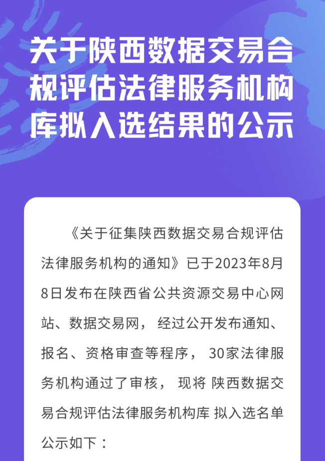 通知称:《关于征集陕西数据交易合规评估法律服务机构的通知》已于2023年8月8日发布在陕西省公共资源交易中心网站、数据交易网,经过公开发布通知、报名、资格审查等程序,30家法律服务机构通过了审核,现将陕西数据交易合规评估法律服务机构库拟入选名单公示如下: