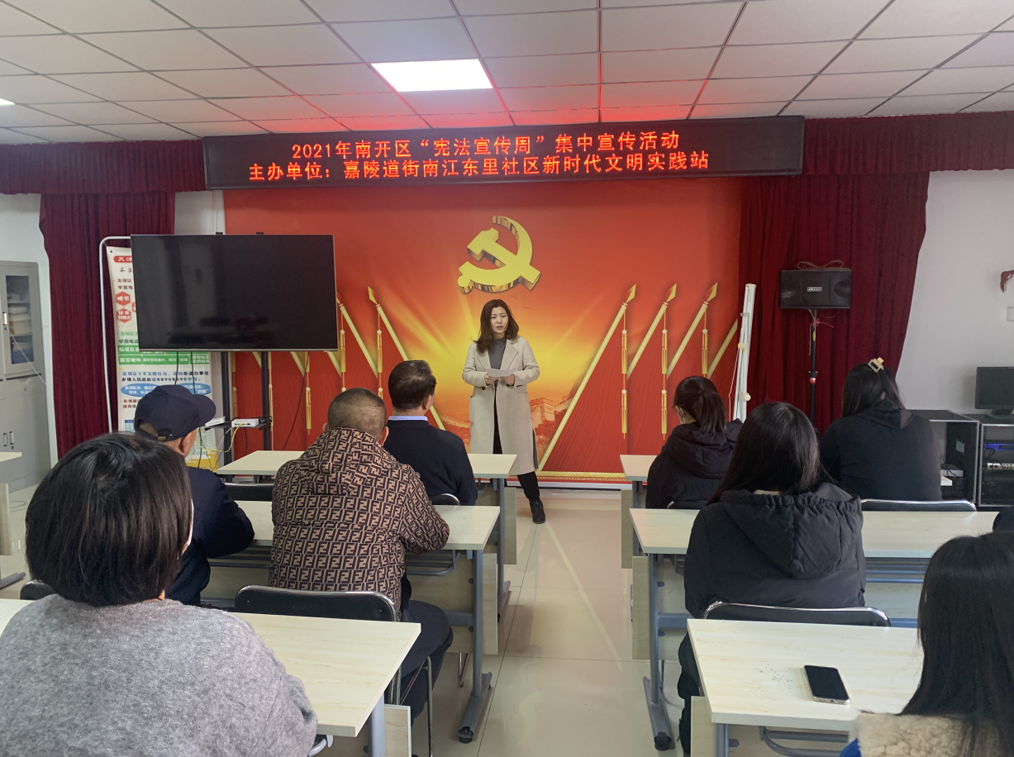 2021年11月30日,天津益清律师事务所郭栋梁律师受邀参加由嘉陵道街南江东里社区新时代文明实践站主办的南开区“宪法宣传周”集中宣传活动,为社区居民开展普法讲座。