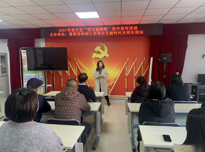 为更好维护社区居民合法权益,增强其知法、懂法、守法、用法意识,2021年11月30日,天津益清律师事务所郭栋梁律师受邀参加由嘉陵道街南江东里社区新时代文明实践站主办的南开区“宪法宣传周”集中宣传活动,为社区居民开展普法讲座。